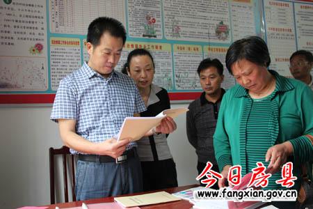 圖為縣委常委、政法委書記杜啟察看野人谷鎮(zhèn)杜川村社會綜治工作檔案