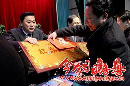 圖為縣委書記沈明云為紅旗單位頒獎