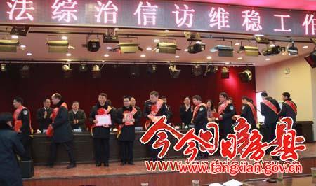 會上,蔡賢忠還與各鄉鎮簽訂了2014年綜治、信訪責任書;會議對2013年度全縣社會管理綜合治理工作優勝責任區、優秀責任人、先進單位、先進工作者、優秀平安村(社區)和2013年度信訪工作先進單位、示范鄉鎮、先進個人,以及房縣見義勇為稱號獲得者李麗、全縣十佳政法單位、十佳政法干警等進行了表彰。