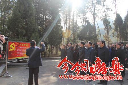 在鳳凰山烈士陵園,沈明云一行代表縣委縣政府向革命烈士紀念碑敬獻了花圈。在縣委常委、組織部部長陳淵帶領下,全體黨員干部面對革命烈士紀念碑和鮮艷的黨旗,莊嚴舉起右手,重溫入黨誓詞,并聆聽了原縣委辦副主任孫希清講述的房縣革命史。