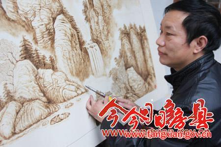 烙畫又稱燙畫、火筆畫,作為國畫的一種獨特表現形式,是用燒紅的烙鐵模仿繪畫的方式,將畫好的圖案烙在竹木、棉布、等材料上。據了解,今年52歲的許光建,出生在城關鎮中西關的一個烙畫世家,爺爺許正林、父親許大壽都是房縣著名的烙畫藝人。許光建6歲師承父親許大壽學習國畫及烙畫基本功; 8歲練習制作烙畫;18歲開始獨立制作烙畫作品。他創作的烙畫作品《云龍》《虎》《江山萬里圖》《會仙圖》等作品在國內多次比賽中獲得獎項,并被國家《美術報》等媒體先后報道。 (付培文 攝)