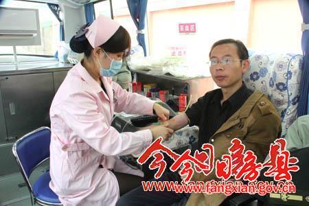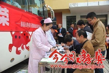 21日,縣政府第一辦公區大院內,公務員們排隊量血壓、驗血型、測試乙肝、審核登記等,等待測試合格后無償獻血。據縣血液中心統計,截止當日下午5點,活動點采集血液總量達15000毫升,共56名政府和黨群戰線公務員參加了無償獻血活動。此次活動為縣政府組織,旨在緩解臨床醫療用血緊張狀況。據悉,當天除公務員外,房縣登山戶外運動協會也組織了30余名志愿者參加獻血。(高書文 楊中華 攝)