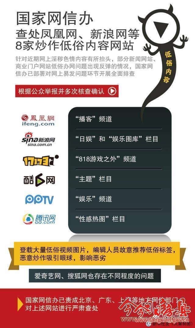 根據公眾舉報并多次核查確認,鳳凰網“播客”頻道、新浪網“日娛”和“娛樂圖庫”欄目、17173網“818游戲之外”頻道、酷6網“主題”欄目、PPTV網“娛樂”頻道、騰訊網“性感熱圖”欄目等登載大量低俗視頻圖片,編輯人員故意推薦低俗標簽,惡意炒作吸引眼球,影響惡劣。愛奇藝網、搜狐網也存在一定問題。國家網信辦已責成北京、廣東、上海等地方網信部門對上述網站進行嚴肅查處。目前,相關地方網信部門已分別對網站負責人進行執法談話,提出嚴厲批評,對6家網站的7個欄目或頻道采取關閉措施,并責令網站全面整改。