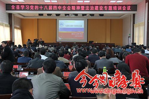 今日房縣網(wǎng)訊 記者 陳銳 報道: 為認真貫徹落實十八屆四中全會精神,切實增強全縣領導干部依法執(zhí)政、依法行政意識,提高基層依法治理水平,建設法治房縣, 29日,我縣舉行學習貫徹黨的十八屆四中全會精神暨法制建設專題會議。縣領導柯大成、蔡賢忠、王啟云、陸毅、姚天國、王家波、徐錦鳳、陳淵、張永平、杜啟學、高明哲、段應詳?shù)仍诩业目h四大家領導出席會議。縣委副書記張慧彬主持會議,并就落實會議精神提出相關要求。各縣直單位、鄉(xiāng)鎮(zhèn)主要負責人300余人參加會議。