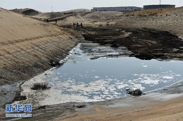 這是甘肅武威境內騰格里沙漠一處排污池,污染物由暗管直接排放至沙漠(3月21日攝)。近日,經有關部門調查發現,武威榮華工貿有限公司(簡稱榮華公司)向騰格里沙漠腹地違法排放污水8萬多噸,污染面積266畝。目前,榮華公司董事長已被立案調查,兩名直接責任人已被拘留,武威市、涼州區有關部門主要負責人已被停職并接受審查。榮華公司是武威市民營企業,主要生產玉米淀粉、谷氨酸等。經初步調查,榮華公司在環保設施未完工的情況下擅自投產,私設暗管,向沙漠違法排放廢水。新華社記者 陳斌 攝