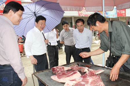 “黃瓜都是自家地里種的?你攤位上豬肉的檢疫印章在哪......”周霽首先來到青峰鎮農貿市場,與賣菜農民親切交談,詢問蔬菜、副食品價格和銷售情況。周霽指出,小菜攤事關大民生,要加強農貿市場的安全管理,確保方便群眾賣菜、買菜,吃的都是“放心菜”。