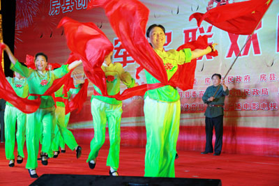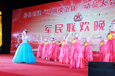 隨后,以“雙擁共建,魚(yú)水情深,軍民攜手,同慶八一”為主題的大型雙擁文藝晚會(huì),在優(yōu)美的舞蹈《盛世花開(kāi)》拉開(kāi)序幕,縣文體局帶來(lái)的歌伴舞《美麗家園》《洗衣歌》、《情深意長(zhǎng)》,駐軍部隊(duì)帶來(lái)的歌曲串燒《軍中綠花》《紅旗飄飄》,唱出了軍人心中對(duì)祖國(guó)、對(duì)家人那份最真摯的情感;武警中隊(duì)表演的格斗操《男兒當(dāng)自強(qiáng)》、小品《女漢子》,縣人武部表演的《精忠報(bào)國(guó)》,氣勢(shì)宏大,剛強(qiáng)有力,突出當(dāng)代軍人的颯爽英姿,展現(xiàn)了人民子弟兵的優(yōu)良傳統(tǒng)和新時(shí)代官兵的良好風(fēng)貌;老城分會(huì)送上的《擁軍秧歌》,表達(dá)了房縣軍民魚(yú)水相依的深情厚誼,博得了現(xiàn)場(chǎng)觀眾的陣陣掌聲。