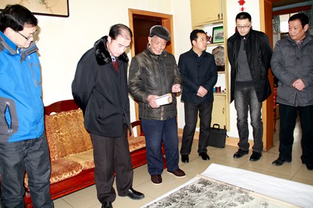 柯大成一行現(xiàn)場觀看張宗權(quán)作品《房陵古城圖》