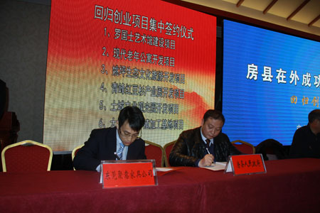 座談會(huì)上播放了房縣回歸創(chuàng)業(yè)宣傳片《房縣我永遠(yuǎn)的家》,北京房縣商會(huì)會(huì)長(zhǎng)付海兵致賀辭。縣委常委、副縣長(zhǎng)高明哲代表縣委、縣政府與回歸創(chuàng)業(yè)代表現(xiàn)場(chǎng)簽訂了羅國(guó)士藝術(shù)館建設(shè)項(xiàng)目、現(xiàn)代老年公寓開發(fā)項(xiàng)目,青峰鎮(zhèn)、土城鎮(zhèn)、大木廠鎮(zhèn)、姚坪鄉(xiāng)人民政府分別與回歸創(chuàng)業(yè)代表簽訂了青峰紅豆杉產(chǎn)業(yè)園開發(fā)項(xiàng)目、土城農(nóng)業(yè)觀光園開發(fā)項(xiàng)目、大木肉牛養(yǎng)殖加工基地項(xiàng)目、姚坪彪虎溝生態(tài)文化旅游開發(fā)。在外創(chuàng)業(yè)成功人士余行兵、孔凡強(qiáng)等作了商會(huì)情況介紹及回歸創(chuàng)業(yè)打算,對(duì)家鄉(xiāng)經(jīng)濟(jì)社會(huì)發(fā)展談了自己的看法,提出了寶貴的意見(jiàn)和建議。他們紛紛表示,將努力抓住建設(shè)綠色房縣、創(chuàng)新房縣、法治房縣、文明房縣、小康房縣的寶貴機(jī)遇,積極投身于房縣建設(shè)中,與家鄉(xiāng)人民一道為促進(jìn)房縣經(jīng)濟(jì)社會(huì)持續(xù)快速發(fā)展作出更大貢獻(xiàn)。