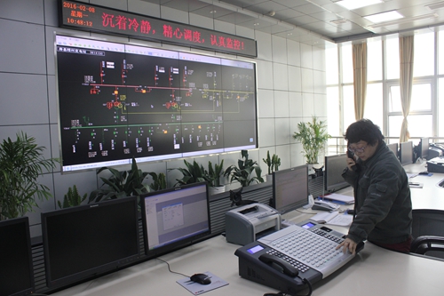 圖為縣供電公司電力調度中心職工薛娟正聯系電力搶修班組檢查某地電網情況。