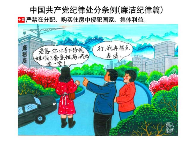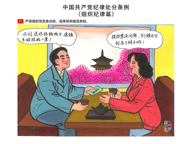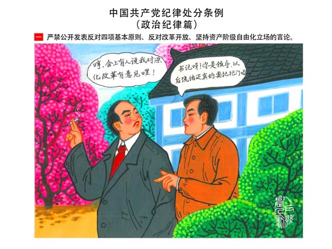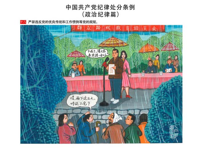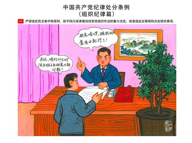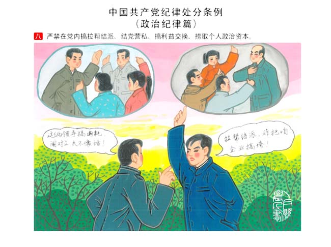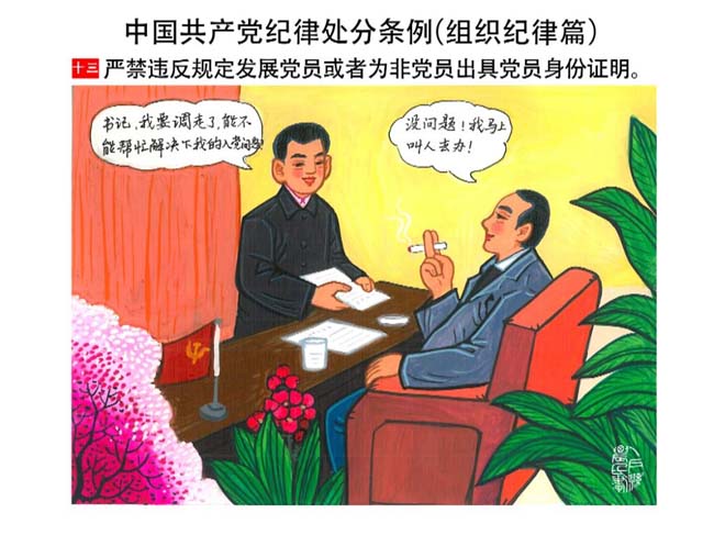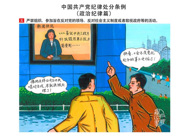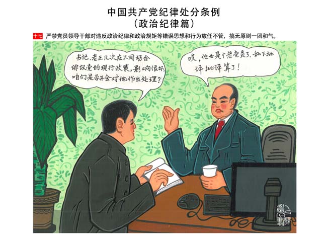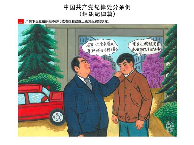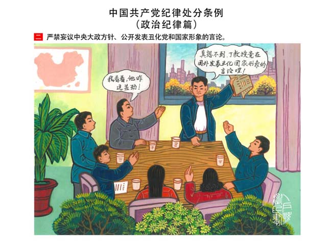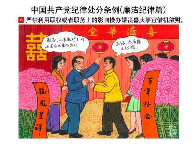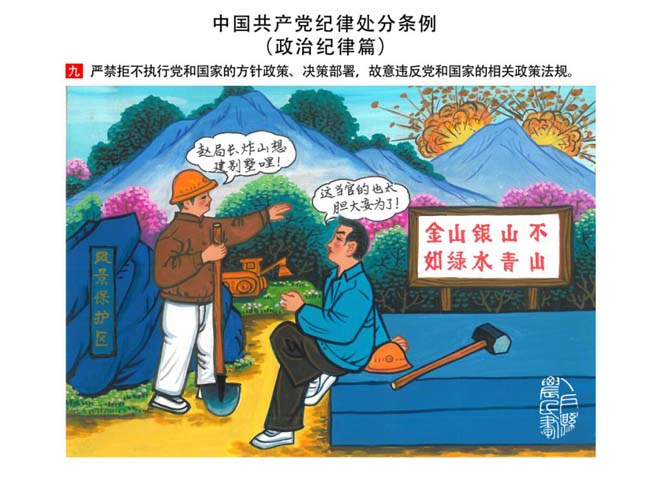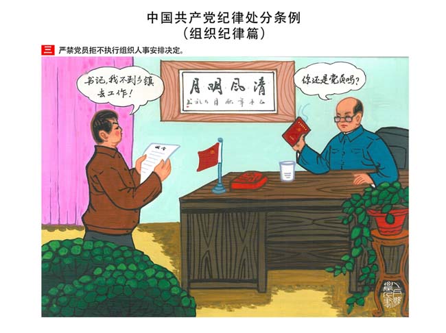 編者按:新修訂的《中國共產(chǎn)黨紀(jì)律處分條例》,將黨章和其他主要黨內(nèi)法規(guī)對(duì)黨組織和黨員的紀(jì)律要求細(xì)化,充分體現(xiàn)了黨紀(jì)嚴(yán)于國法。在“分則”原來以破壞社會(huì)主義市場(chǎng)經(jīng)濟(jì)秩序等為主的十類違紀(jì)行為,整合規(guī)范為政治紀(jì)律、組織紀(jì)律、廉潔紀(jì)律、群眾紀(jì)律、工作紀(jì)律和生活紀(jì)律等六類,使《條例》的內(nèi)容真正回歸黨的紀(jì)律,為廣大黨員開列了一份“負(fù)面清單”。 為幫助廣大黨員干部進(jìn)一步學(xué)習(xí)、掌握黨內(nèi)法規(guī),清楚底線、明白規(guī)矩,縣紀(jì)委推出“農(nóng)民畫解讀‘六大紀(jì)律’”系列,以供大家學(xué)習(xí)。