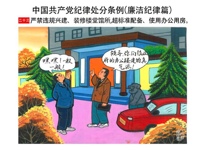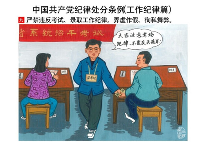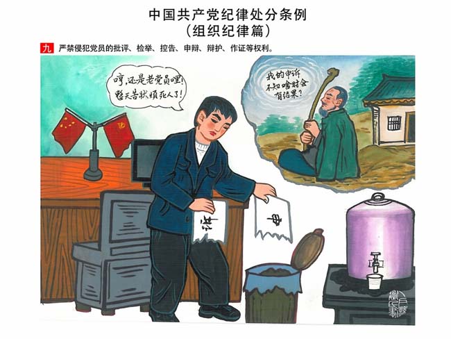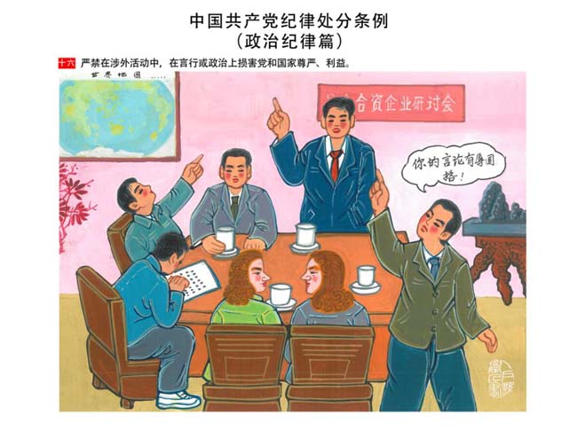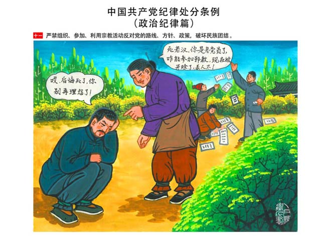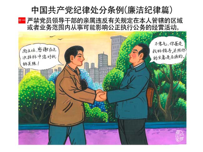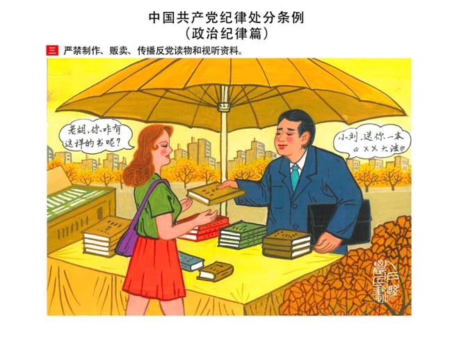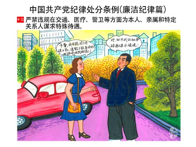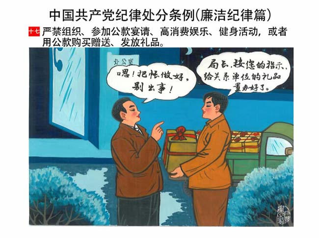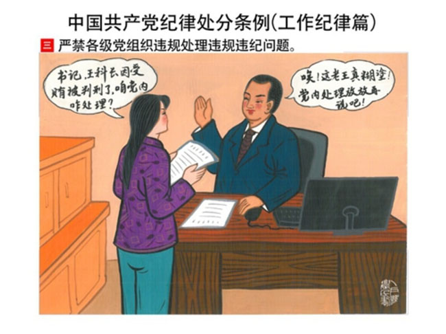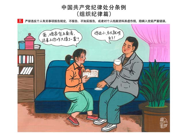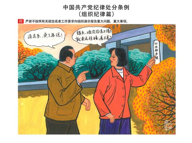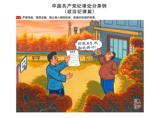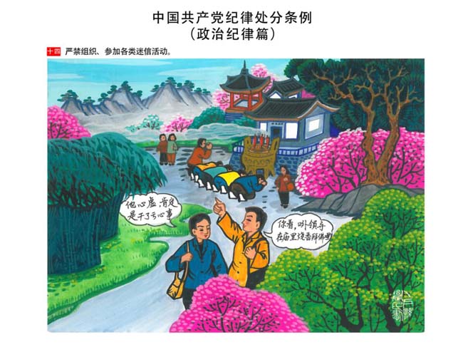 編者按:新修訂的《中國共產(chǎn)黨紀(jì)律處分條例》,將黨章和其他主要黨內(nèi)法規(guī)對(duì)黨組織和黨員的紀(jì)律要求細(xì)化,充分體現(xiàn)了黨紀(jì)嚴(yán)于國法。在“分則”原來以破壞社會(huì)主義市場(chǎng)經(jīng)濟(jì)秩序等為主的十類違紀(jì)行為,整合規(guī)范為政治紀(jì)律、組織紀(jì)律、廉潔紀(jì)律、群眾紀(jì)律、工作紀(jì)律和生活紀(jì)律等六類,使《條例》的內(nèi)容真正回歸黨的紀(jì)律,為廣大黨員開列了一份“負(fù)面清單”。 為幫助廣大黨員干部進(jìn)一步學(xué)習(xí)、掌握黨內(nèi)法規(guī),清楚底線、明白規(guī)矩,縣紀(jì)委推出“農(nóng)民畫解讀‘六大紀(jì)律’”系列,以供大家學(xué)習(xí)。