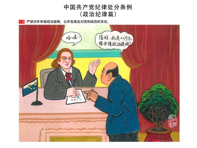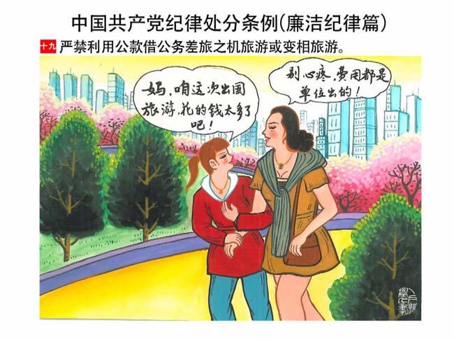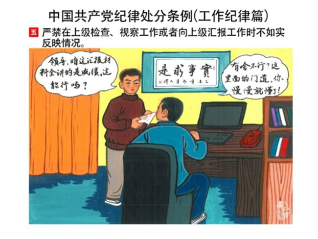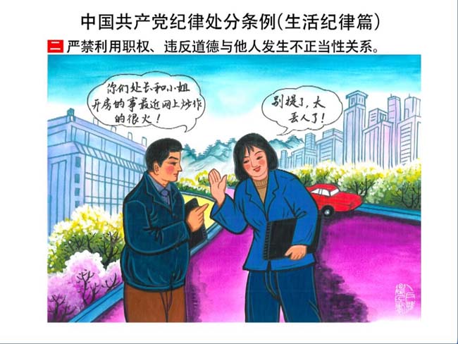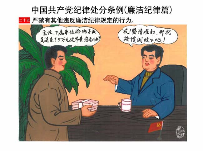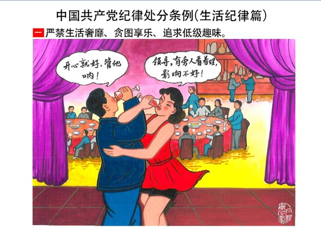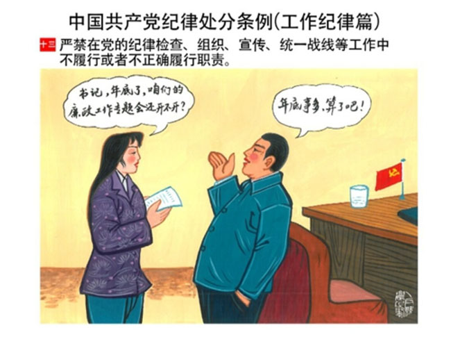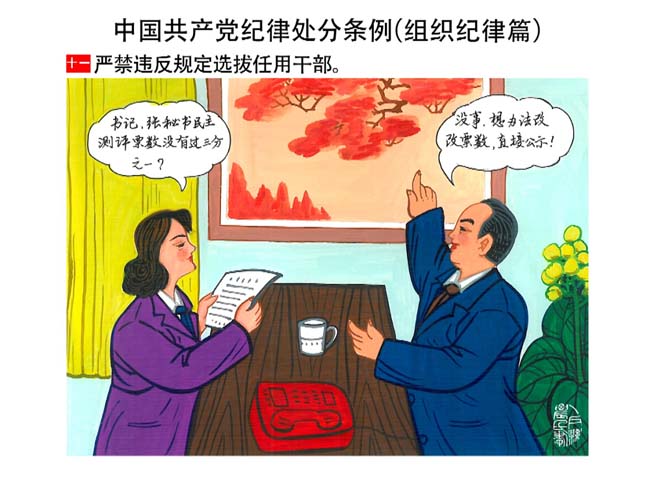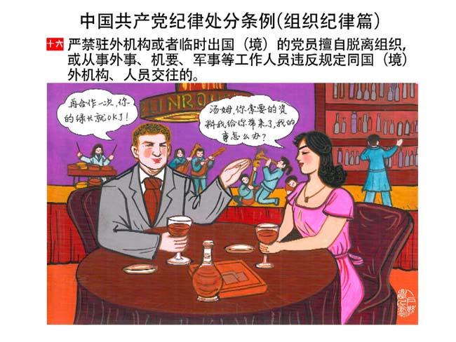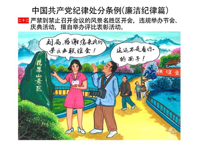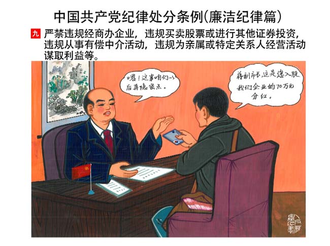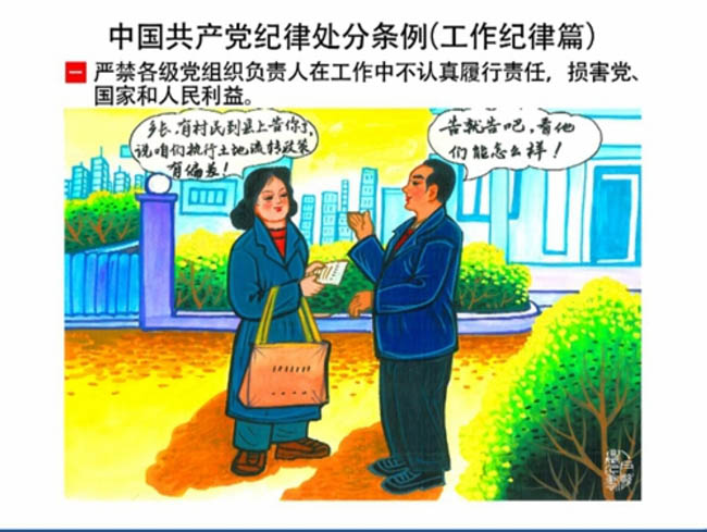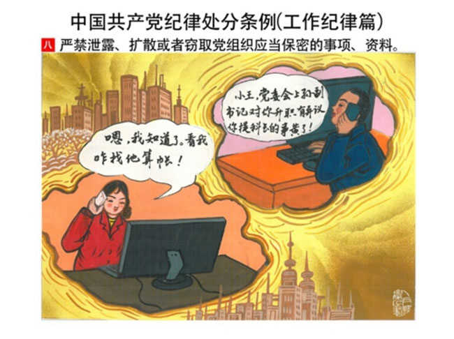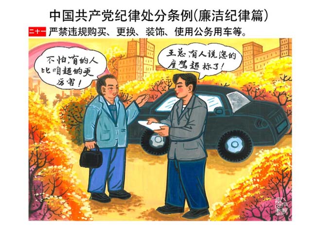 編者按:新修訂的《中國共產(chǎn)黨紀(jì)律處分條例》,將黨章和其他主要黨內(nèi)法規(guī)對(duì)黨組織和黨員的紀(jì)律要求細(xì)化,充分體現(xiàn)了黨紀(jì)嚴(yán)于國法。在“分則”原來以破壞社會(huì)主義市場(chǎng)經(jīng)濟(jì)秩序等為主的十類違紀(jì)行為,整合規(guī)范為政治紀(jì)律、組織紀(jì)律、廉潔紀(jì)律、群眾紀(jì)律、工作紀(jì)律和生活紀(jì)律等六類,使《條例》的內(nèi)容真正回歸黨的紀(jì)律,為廣大黨員開列了一份“負(fù)面清單”。 為幫助廣大黨員干部進(jìn)一步學(xué)習(xí)、掌握黨內(nèi)法規(guī),清楚底線、明白規(guī)矩,縣紀(jì)委推出“農(nóng)民畫解讀‘六大紀(jì)律’”系列,以供大家學(xué)習(xí)。