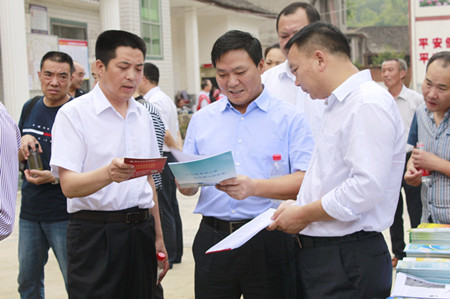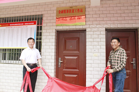 市政府副秘書長賈學云、人行十堰中心支行副行長陳萬和為紅塔鎮潮汪村金融精準扶貧工作站揭牌