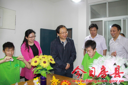 正在進(jìn)行手工藝品制作的語(yǔ)障學(xué)生肖龍威在手語(yǔ)老師的幫助下,向蔡賢忠匯報(bào)了自己的學(xué)習(xí)情況。肖龍威十分好學(xué),從十字繡、絲網(wǎng)花到現(xiàn)在的串珠工藝品制作,他樣樣精通,最重要的是他在學(xué)校學(xué)會(huì)了感恩和照顧他人,多次被評(píng)為市、縣級(jí)三好學(xué)生,在2013年被評(píng)為十堰市首屆十佳美德少年。蔡賢忠要求隨行相關(guān)部門負(fù)責(zé)人要給予殘疾孩子更多關(guān)懷,讓孩子們生活在同一片藍(lán)天下。