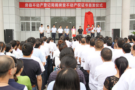 今日房縣網訊 通訊員 周海 柯啟文 報道: 6月25日,我縣舉行不動產登記局(不動產登記中心)揭牌暨不動產權證書首發儀式,縣委常委、副縣長高明哲、十堰市國土資源局總工程師王偉出席儀式,為不動產登記局(不動產登記中心)揭牌,并頒發了房縣首批《不動產權證書》,國土、農業、林業等相關部門負責人參加了儀式。該儀式的舉行標志著房縣不動產登記工作全面啟動。