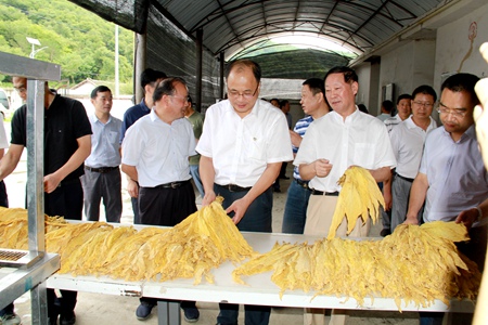 省煙草專賣局局長(zhǎng)趙全意、湖北中煙公司總經(jīng)理郜強(qiáng)一行察看野人谷片區(qū)煙葉種植情況