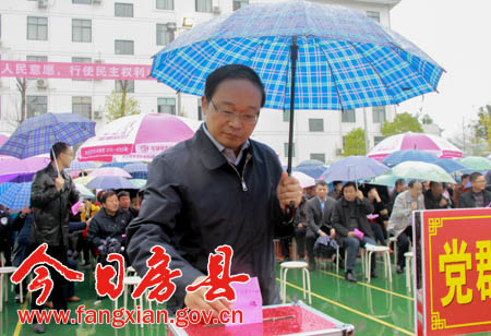 提前到達(dá)黨群、政法戰(zhàn)線第一選區(qū)的縣委書記、縣人大常委會主任蔡賢忠,以普通選民的身份,和選民們一同領(lǐng)票、填票、排隊(duì)、投票、等候計票和宣布結(jié)果。雖然選舉中途下起中雨,但整個會場秩序井然,選舉有序順利進(jìn)行。