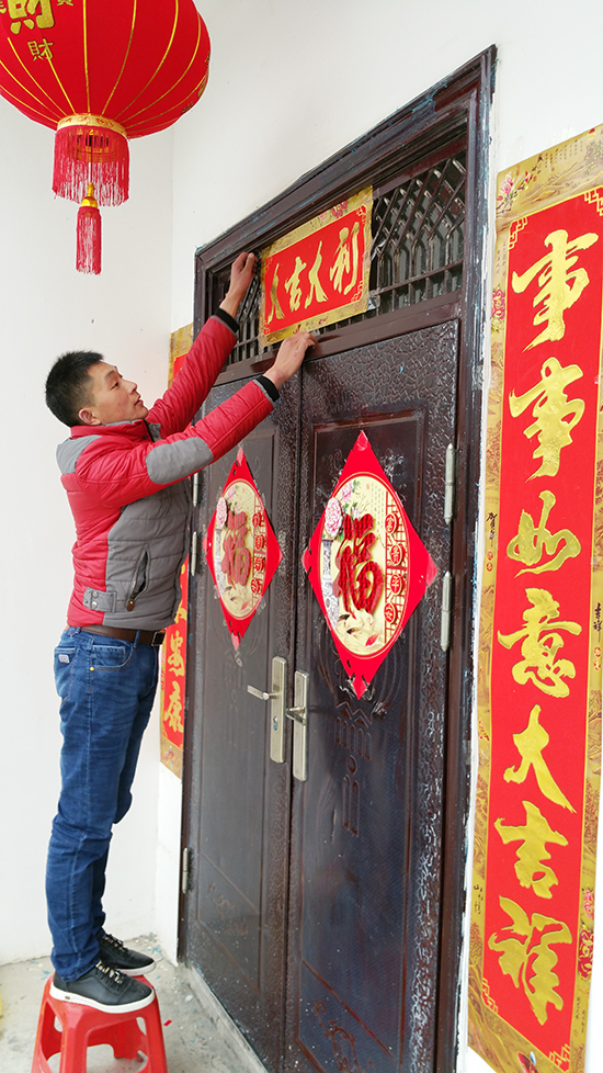 今天是大年三十,是辭舊迎新的時刻。一大早,記者在我縣鄉村各地看到,家家戶戶都在忙著張貼春聯,到處洋溢著春節的喜慶氣氛。火紅的春聯貼出了喜慶,貼出了年味兒,更貼出了人們對新一年生活的美好希望和祝愿。圖為黑獐溝搬遷安置小區戶主張先生正在張貼春聯。(毛俊杰攝)