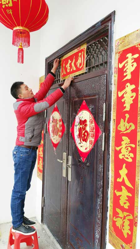 大年三十,是辭舊迎新的時刻。一大早,記者在我縣鄉村各地看到,家家戶戶都在忙著張貼春聯,到處洋溢著春節的喜慶氣氛?;鸺t的春聯貼出了喜慶,貼出了年味兒,更貼出了人們對新一年生活的美好希望和祝愿。圖為黑獐溝搬遷安置小區戶主張先生正在張貼春聯。