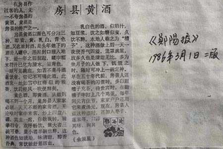 據查,這篇介紹房縣黃酒的文章刊載在《鄖陽報》1986年3月1日第二版,是迄今為止發現最早的在新聞媒體宣傳房縣黃酒的文章。