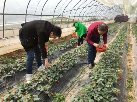 草莓棚里春來早。近日,位于軍店鎮禾益天下生態觀光園的草莓大棚里,翠綠的草莓苗上結滿了鮮紅誘人的果實,引來游客紛至沓來采摘。 ?。ㄌ锾m蘭 攝)