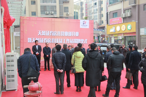 今日房縣網(wǎng)訊 記者 陳銳 報道: 2月22日,天風(fēng)證券房縣營業(yè)部開業(yè)暨天風(fēng)證券房縣扶貧工作站揭牌儀式在人和路舉行,標(biāo)志著天風(fēng)證券與我縣開展“一司一縣”結(jié)對扶貧工作邁出了實質(zhì)性一步。縣委書記、縣人大常委會主任蔡賢忠,天風(fēng)證券產(chǎn)品服務(wù)部總經(jīng)理胡揚飛出席揭牌儀式并為扶貧工作站揭牌,縣領(lǐng)導(dǎo)付必久、丁選清出席揭牌儀式。
