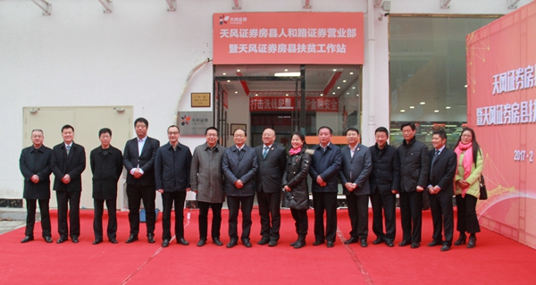 縣委書記蔡賢忠,天風(fēng)證券產(chǎn)品服務(wù)部總經(jīng)理胡揚飛為天風(fēng)證券房縣營業(yè)部及扶貧工作站揭牌
