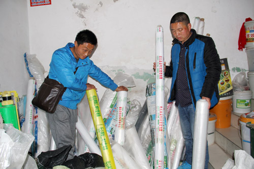 青峰鎮(zhèn)村臥牛觀村村民陳務(wù)軍和同伴一起在農(nóng)資專賣店購買地膜(趙愛平攝)