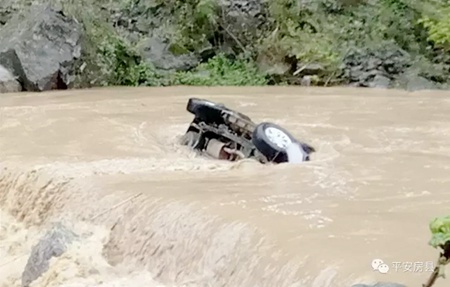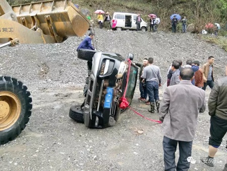 今日房縣網訊 通訊員許世鵬 報道:受持續強降雨影響,9日,九道鄉八里坡村,一輛接親的婚車因路況不熟被河水沖翻4人被困。九道派出所長張立奎途經此地,迅速組織當地群眾并調集正在附近施工的鏟車進行救援。最終,將車輛和人員成功營救上岸。