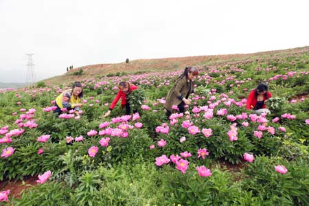 8日,軍店鎮三溪中村藥材園的村民們正在芍藥基地除草。2015年以來,軍店鎮以脫貧攻堅為主導,大力發展特色產業,共引進市場主體23家,成立種養殖專業合作社57個,目前已發展1萬畝核桃基地、3萬畝中藥材基地、5000畝苗木花卉基地,打造生態觀光農業示范元10000畝。通過產業發展,農民年均增收6000至8000元。(趙愛平 劉智寶 攝)