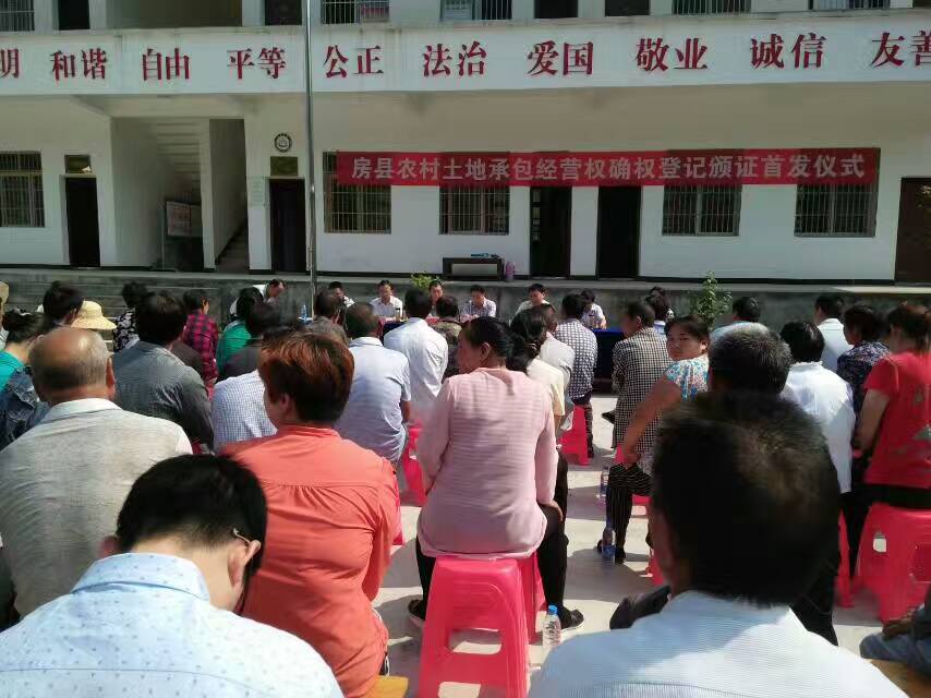 今日房縣網訊 通訊員房宣 報道:6月2日上午, 房縣農村土地承包經營權確權登記頒證首發儀式在五臺鄉金牛寺村舉行, 標志著我縣農民承包土地具有了法律意義上的“身份證”, 真正讓農民吃上了“定心丸”。市確權辦主任、經管局局長羅會權、縣政府副縣長董詮聞出席儀式。