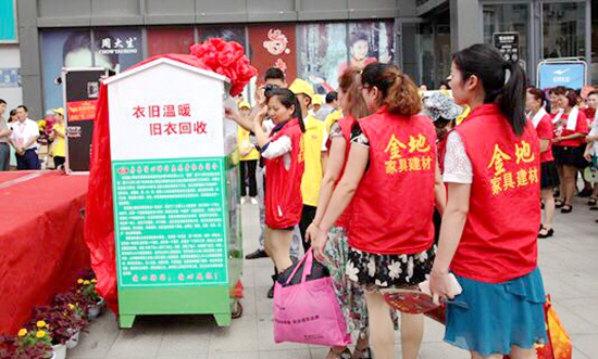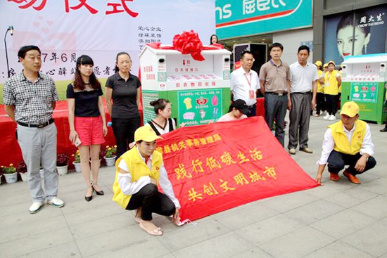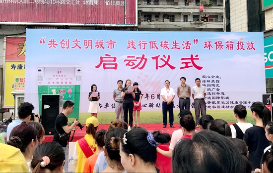 儀式結束后,青年志愿者向觀眾現場演示了如何向環保箱正確分類投放舊物。愛心專車運送首批35個舊物回收環保箱,至縣城中心地段的商場、超市、居民小區、十字路口等指定位置進行固定安裝。