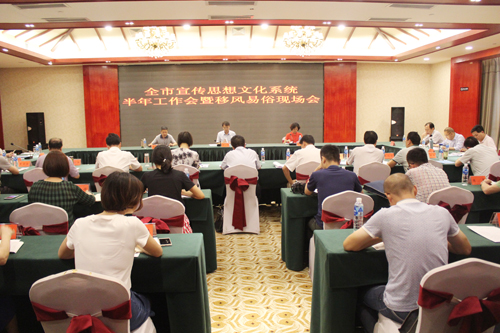 在隨后召開的全市宣傳系統(tǒng)半年工作會暨移風(fēng)易俗會上,周鋒對全市宣傳思想文化系統(tǒng)上半年工作情況進(jìn)行了回顧總結(jié)。對全市宣傳系統(tǒng)下半年工作,他要求各縣、市、區(qū)及市直宣傳思想文化單位,一是要進(jìn)一步筑牢意識形態(tài)防線,確保意識形態(tài)領(lǐng)域安全;二是要以喜迎黨的十九大為主線,抓好主題宣傳,進(jìn)一步創(chuàng)新宣傳形式,營造氛圍;三是要謀劃文化產(chǎn)業(yè)項目,著力推進(jìn)文化小康建設(shè);四是要全力以赴,推進(jìn)文明創(chuàng)建工作。
