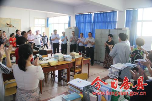 蔡賢忠一行走進房縣一中教師集中辦公區(qū),與課間休息的教師們親切握手,向他們致以教師節(jié)的問候,并祝愿學校教育教學工作再創(chuàng)新輝煌。他還向在場的教職工們介紹了房縣一中遷建工作的進展情況以及新校區(qū)的選址過程、基礎(chǔ)建筑的設(shè)計、辦學理念,生動的描繪了未來師生們在新校區(qū)學習、生活的美好藍圖。