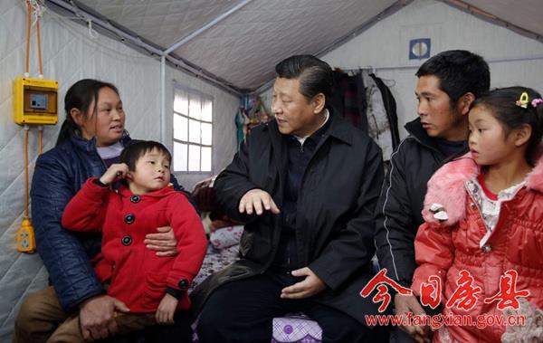 2015年1月19日,習(xí)近平來到云南省魯?shù)榈卣馂?zāi)區(qū)過渡安置點(diǎn)看望受災(zāi)群眾。新華社記者 鞠鵬 攝