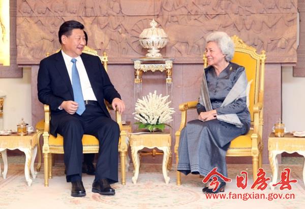 2016年10月13日,習(xí)近平在金邊看望柬埔寨太后莫尼列。莫尼列太后特意請(qǐng)習(xí)近平在西哈努克太皇生前常坐的椅子上就座。新華社記者 姚大偉 攝