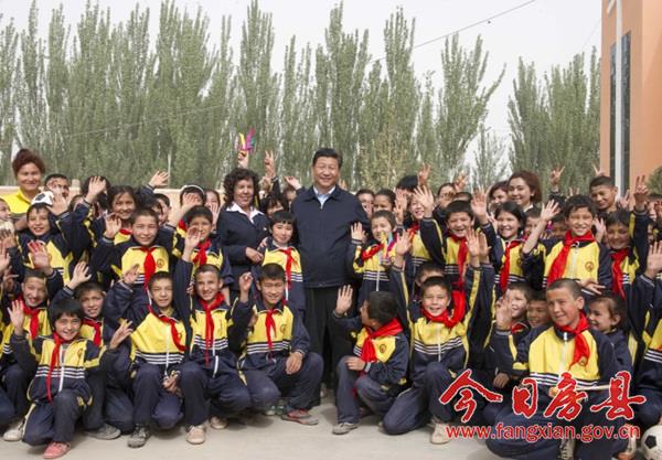 2014年4月28日,習(xí)近平在新疆疏附縣托克扎克鎮(zhèn)中心小學(xué)同師生們合影。新華社記者 謝環(huán)馳 攝