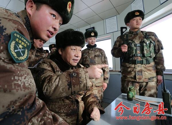 2014年1月26日,習(xí)近平專程來到內(nèi)蒙古軍區(qū)邊防某部,親切看望慰問戍邊官兵。這是習(xí)近平仔細(xì)察看三角山哨所執(zhí)勤設(shè)施,動(dòng)情地對(duì)執(zhí)勤哨兵說:“今天,我和你們一起執(zhí)勤站崗。”新華社記者 李剛 攝