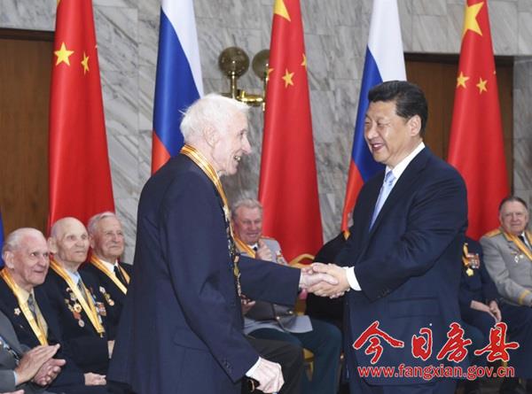 2015年5月8日,習(xí)近平在莫斯科會(huì)見曾在中國東北抗日戰(zhàn)場上和衛(wèi)國戰(zhàn)爭中浴血奮戰(zhàn)的18名俄羅斯老戰(zhàn)士代表。在為老戰(zhàn)士頒獎(jiǎng)時(shí),習(xí)近平看到對(duì)方腿腳不便,馬上說:“我過去給您頒獎(jiǎng),您就別過來了。”新華社記者 張鐸 攝