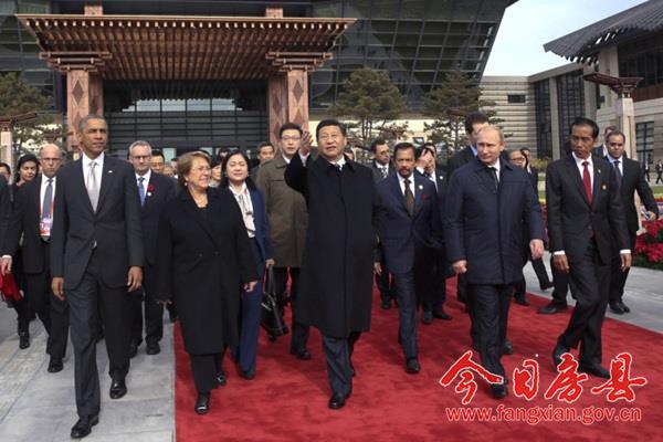 2014年11月11日,習(xí)近平與參加2014年亞太經(jīng)合組織領(lǐng)導(dǎo)人非正式會(huì)議的各成員經(jīng)濟(jì)體領(lǐng)導(dǎo)人、代表共植APEC亞太伙伴林。這是習(xí)近平與各成員經(jīng)濟(jì)體領(lǐng)導(dǎo)人、代表前往植樹。新華社記者 蘭紅光 攝