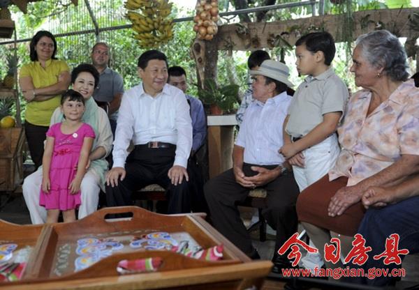 2013年6月3日,習(xí)近平和夫人彭麗媛走訪哥斯達(dá)黎加埃雷迪亞省圣多明哥小鎮(zhèn)農(nóng)戶薩莫拉一家,與薩莫拉一家人親切交流。新華社記者 張鐸 攝