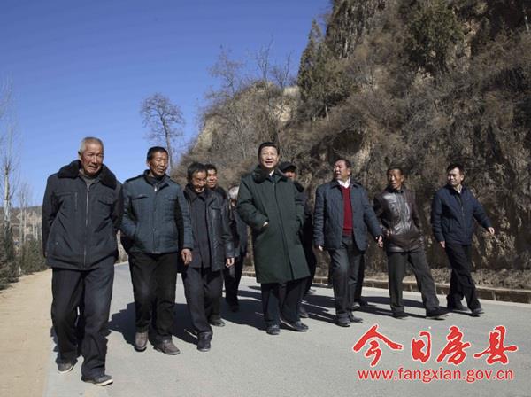 2015年2月13日上午,習(xí)近平在延安市延川縣文安驛鎮(zhèn)梁家河村調(diào)研時(shí)同村民邊走邊聊。新華社記者 蘭紅光 攝