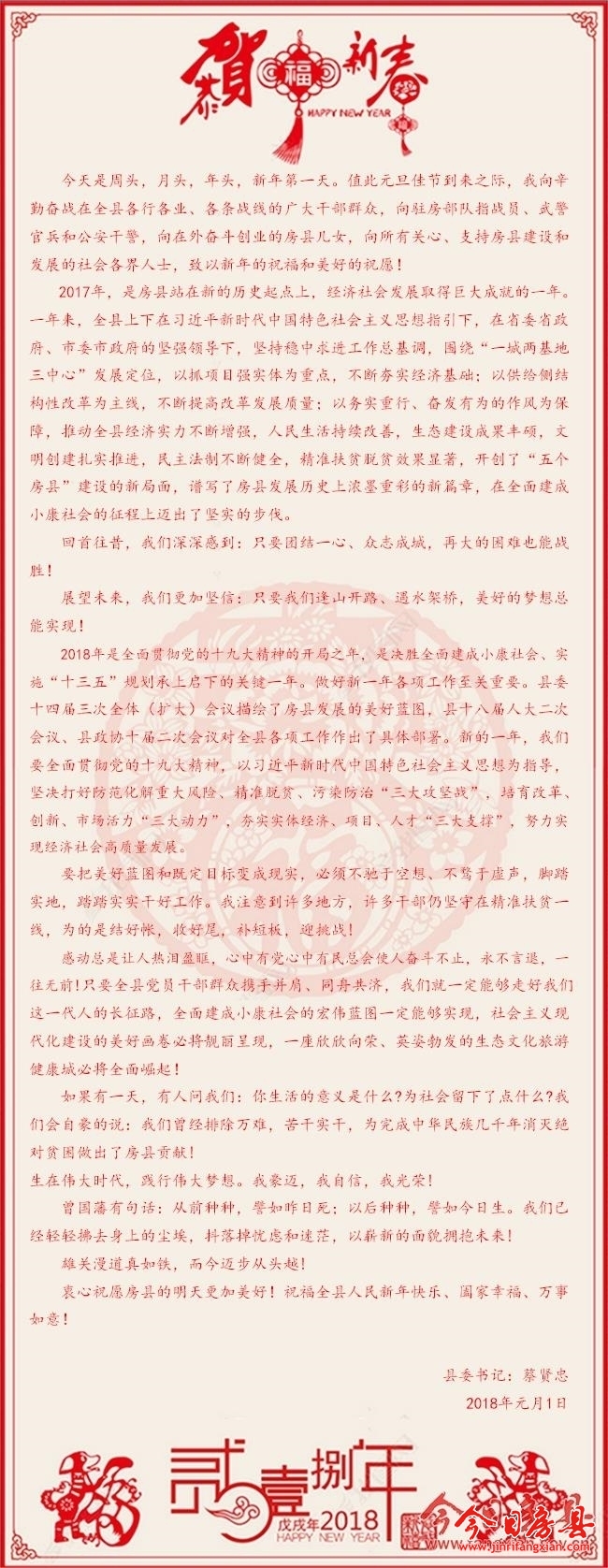 縣委書記蔡賢忠2018年新年寄語