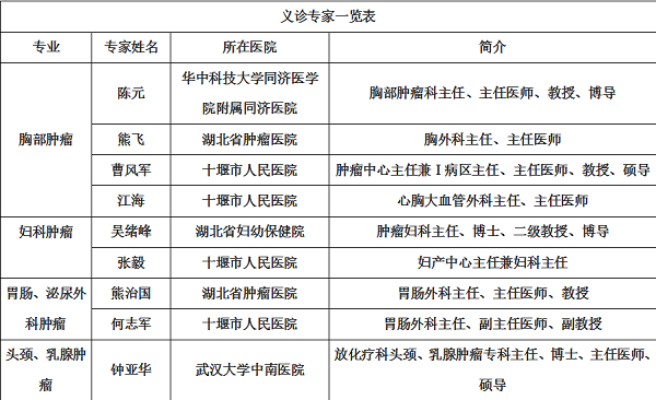 專 家:湖北省腫瘤醫(yī)院、華中科技大學(xué)同濟(jì)醫(yī)學(xué)院附屬同濟(jì)醫(yī)院、華中科技大學(xué)同濟(jì)醫(yī)學(xué)院附屬協(xié)和醫(yī)院、武漢大學(xué)人民醫(yī)院、武漢大學(xué)中南醫(yī)院、湖北省婦幼保健院、十堰市人民醫(yī)院、荊州市第一人民醫(yī)院等400名全省腫瘤專業(yè)精英。