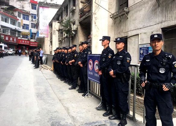 5月23日晚,房縣、茅箭法院四十余名干警來到白河縣準備開展次日執行行動。晚11時,長期不露面、不申報財產且多次拒不履行義務的被申請人黃某恰因糾紛在某派出所接受詢問。得知該消息后,執行干警迅速行動,將其攔截在派出所門口,對其依法進行拘留并連夜帶回房縣看守所,此時已經是清晨5時。5月24日早9點,房縣、茅箭及白河法院11部警車同時到達執行現場,在白河縣當地政法委、法院大力支持配合下,商鋪所在街道已由當地交警進行了交通管制,當地公安出動20名防暴警察、預留15名特警支持本次執行活動。白河縣法院也派出在院執行干警及法警20余人維持現場秩序。房縣法院分成的四個執行小組對四層商鋪進行分層清理,確保毛胚商鋪無人在場后,指揮施工人員入場圍檔安裝。茅箭法院也對其保全的營銷展示中心(售樓部)進行了騰空清場。執行干警向在現場的被執行人家屬再次釋明拒不履行法院生效法律文書確定義務的法律后果,對其進行勸誡,溝通平和,保障了場地騰空施工的順暢進行。