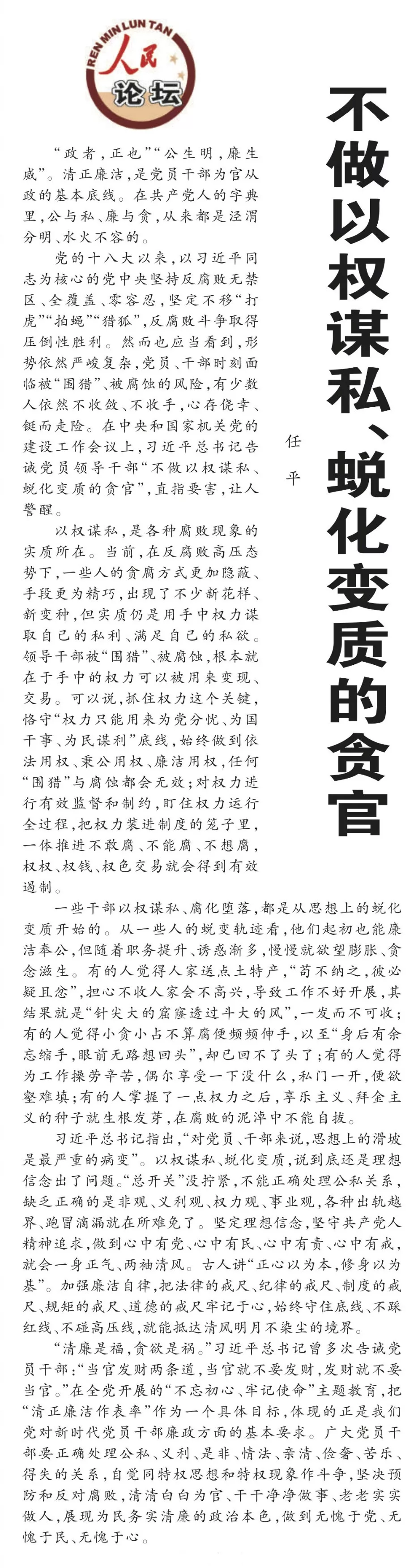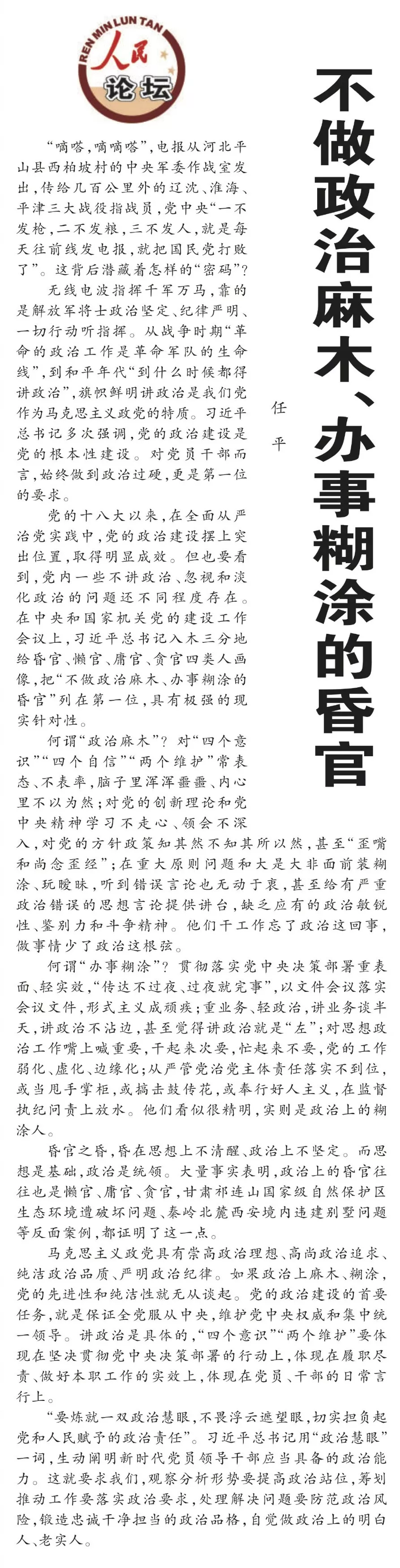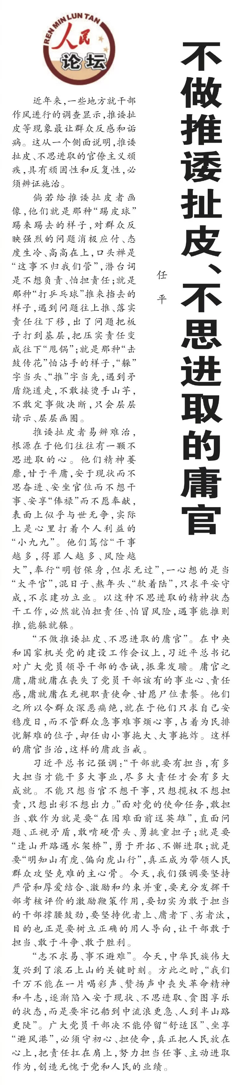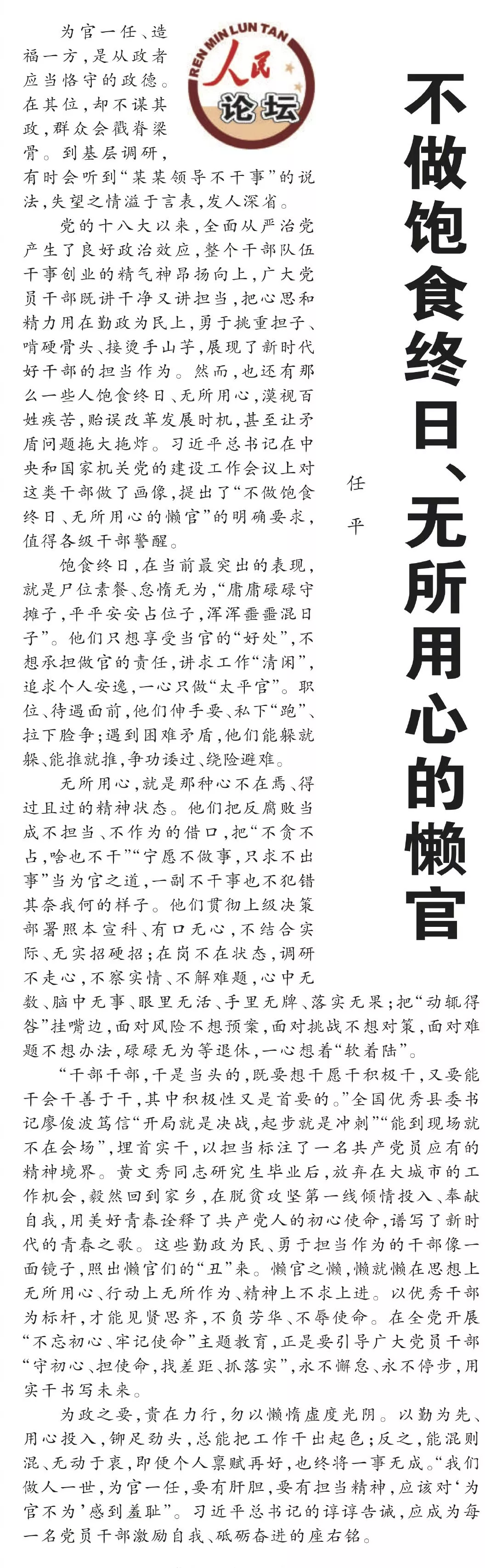 7月15日-18日,人民日?qǐng)?bào)“任平”連續(xù)發(fā)聲,對(duì)昏官、懶官、庸官、貪官四類問(wèn)題干部進(jìn)行了鞭辟入里的分析和批判,號(hào)召?gòu)V大黨員干部堅(jiān)決貫徹落實(shí)習(xí)近平總書(shū)記的指示,踐行新時(shí)代好干部標(biāo)準(zhǔn)。