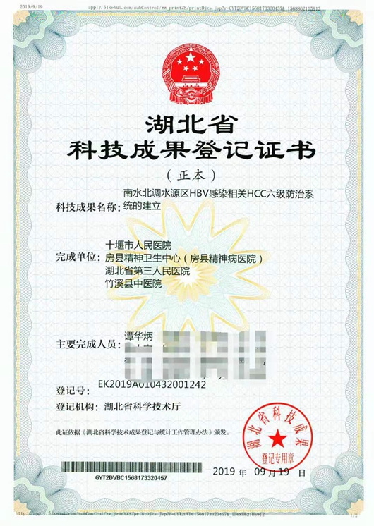 今日房縣網訊 通訊員 任毅科 報道:9月20日,十堰市人民醫院感染肝病科譚華炳主任醫師接到湖北省技術交易所通知,他主持的科研項目《南水北調水源區乙型肝炎病毒感染相關肝癌六級防治系統的建立》,經湖北省技術交易所組織專家委員會鑒定和審核、湖北省科技廳成果處批準,獲湖北省科技成果登記證書。