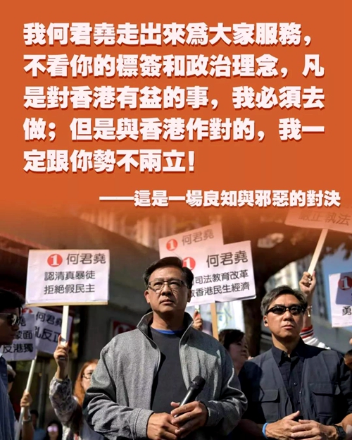 支持建設(shè)力量,維護(hù)正常選舉秩序。何君堯遇刺后,許多正義人士大聲呼吁“還區(qū)選免于恐懼的自由”。的確,在法律限度內(nèi),民主選舉應(yīng)保障參選者表達(dá)觀點(diǎn)、公平競爭的權(quán)利。如果因?yàn)檎驹诮ㄖ屏觥l(fā)出正義呼聲就要慘遭毒手,參選者的人身安全、區(qū)議會(huì)選舉的公正性與安全性就得不到保證。反對(duì)派拒絕譴責(zé)暴力、縱暴煽暴的行為,恰恰是為了讓建設(shè)力量“知難而退”、讓助選市民人人自危,從而在選舉中順利“收割”成果。在這個(gè)意義上說,何君堯不畏、不悔、不退,帶著尚未完全痊愈的刀傷,第一時(shí)間走上“戰(zhàn)場”,起到了鼓舞建設(shè)力量的標(biāo)桿作用,也是凈化選舉環(huán)境的可貴努力。