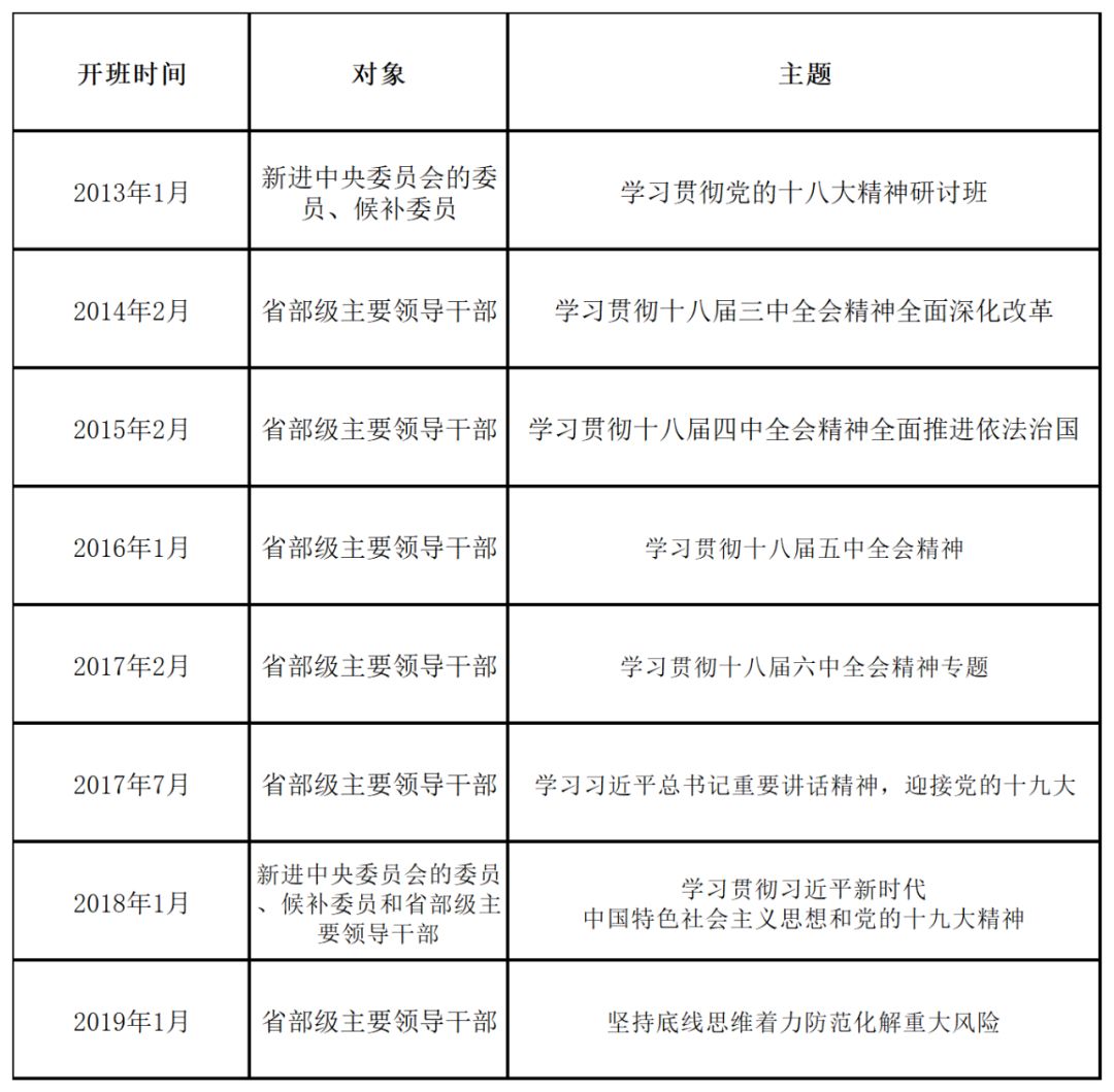 根據(jù)梳理,在中央黨校舉辦的省部級主要領(lǐng)導(dǎo)干部(通常說的“一把手”)專題研討班,一般每年舉辦一次,時間大致為每年1月份或2月份(2017年7月舉行了省部級主要領(lǐng)導(dǎo)干部“學(xué)習(xí)習(xí)近平總書記重要講話精神,迎接黨的十九大”專題研討班),專題研討班主要圍繞學(xué)習(xí)貫徹黨的十八大精神、黨的十九大精神、中央全會及黨中央的重大戰(zhàn)略部署展開,具體梳理如下。